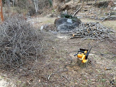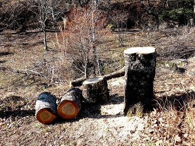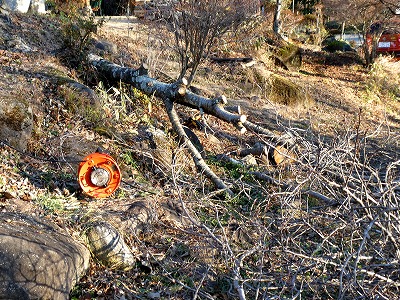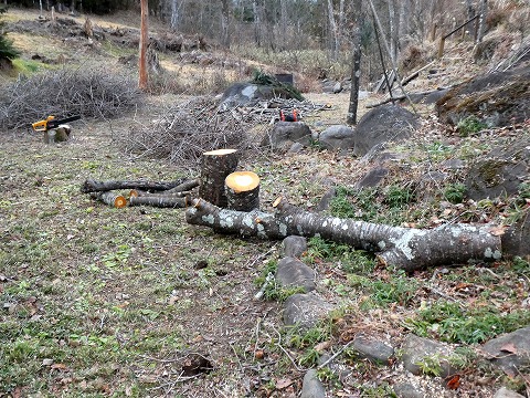 | 大木伐採で乱雑に散らかった幹、枝を切り分けして片付けました。 |