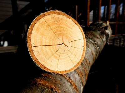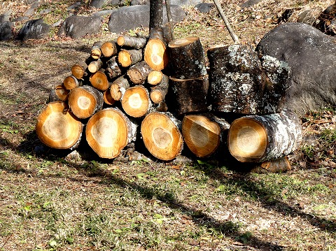 | 伐採した丸太、きのうストーブで燃やす薪の長さに輪切りにして、薪割りが出来る状態にしました。 |