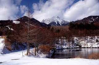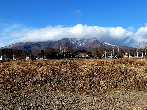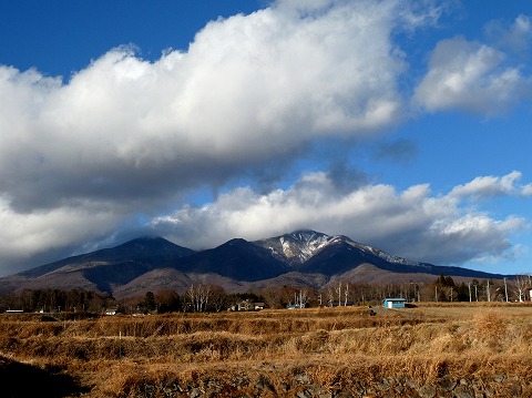| 青い空に白い雲、八ヶ岳は冬の景色を見せていました。 |