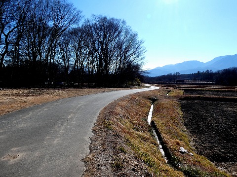| レインボーラインから横に入る道ですが以前は樹木が生い茂り、入りにくい道でしたが、冬枯れと伐採により道幅が広く感じ、入って見ると別荘が建ち並んでいました。甲斐駒は見えましたが樹木に遮られています。 |