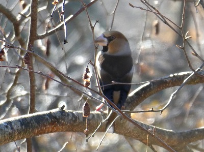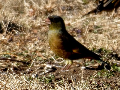 | 太くて大きいクチバシで体長は19センチほどあります。メスに比べ目の周りの黒い部分がはっきりしているのはオスのようです。 |