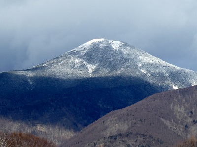 | 雪雲に覆われた編笠山は山頂付近に雪が降ったようです。 |