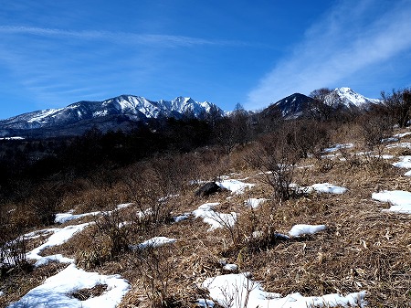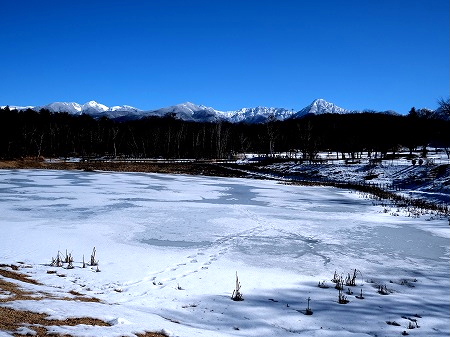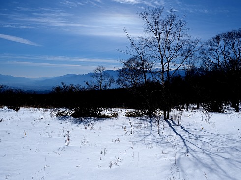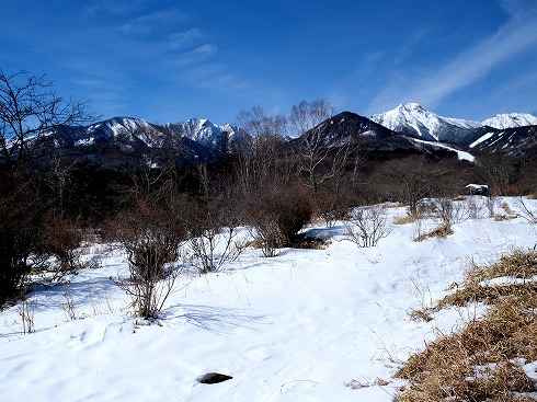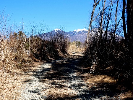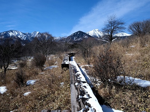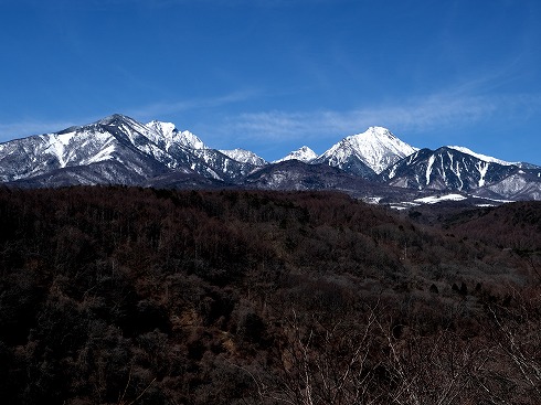 | 冬枯れの癒やしの小径から白く輝く八ヶ岳が望めます。 |