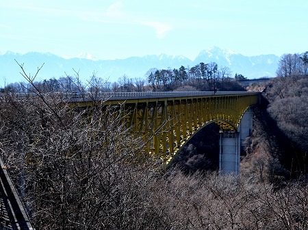 | 八ヶ岳高原大橋駐車場から黄色い橋と南アルプスが見えます。 |