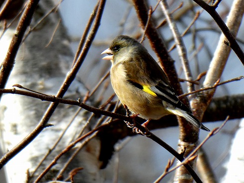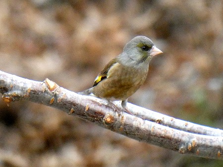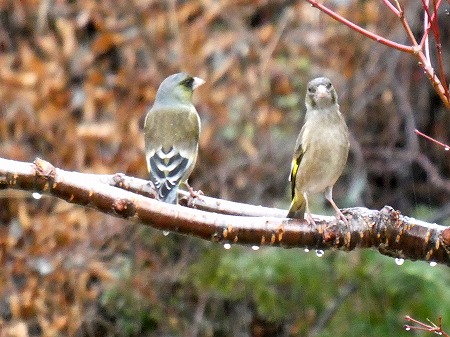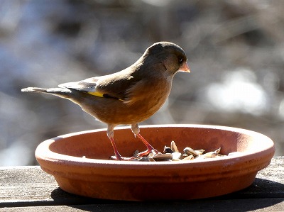 | カワラヒワは毎日やって来ますが餌場にイカルがいるので近づけません。 |