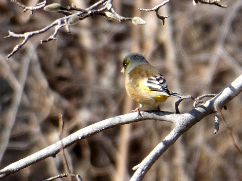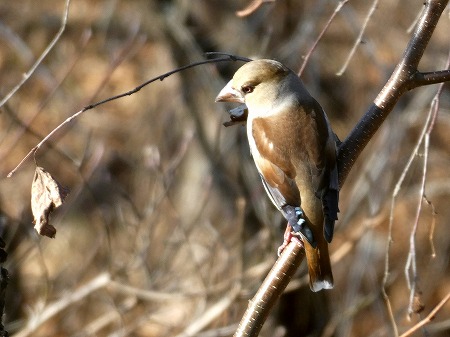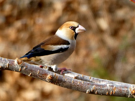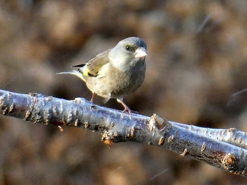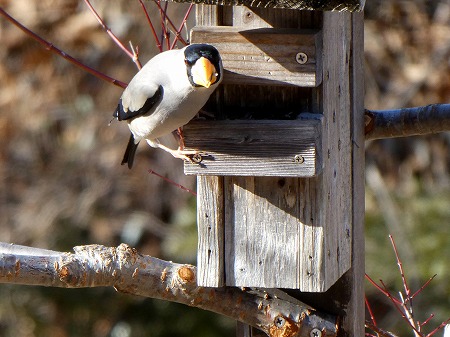 | 顔の半分もありそうな大きく黄色いくちばしのイカルが久しぶりに姿を見せました。 |