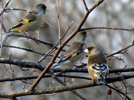 | 写真では三羽しか写っていませんが、何時もカワラヒワは10羽以上で群れてやって来ます。 |