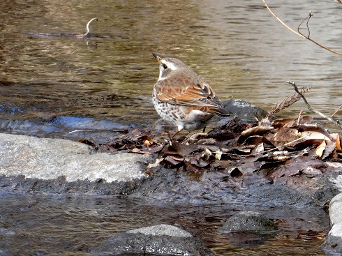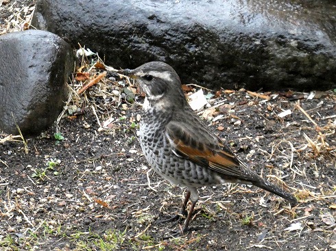 | 三分一湧水公園近くで見かけた「ツグミ」、一見地味に見えますが、オレンジ色の羽根が目立ちます。 |