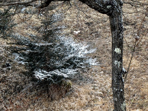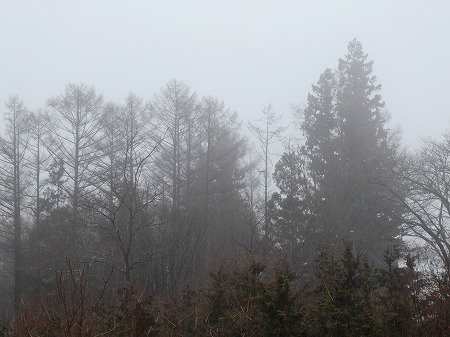 今日、午前中は雪が降りそうな曇空で周りの景色はまったく見えませんでした。