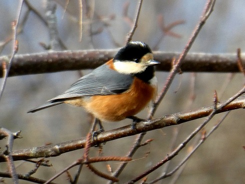 | 珍しくオレンジ色のヤマガラが河川敷にやって来たと思いましたが、頭がグレーで顔の模様も違っています。 |