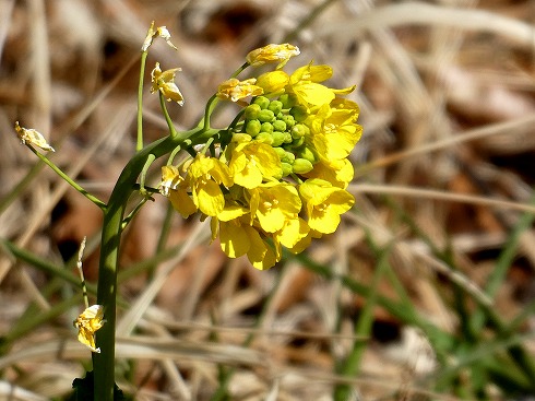 | 冬枯れで茶色い畑の脇に緑の葉に黄色い蕾が付いていました。 |