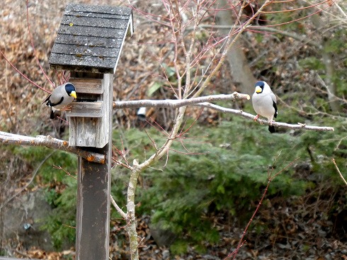 | 餌場に大っきいクチバシのイカルが来ては他の野鳥は近寄れません。 |