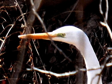 | 餌台の小鳥を観察していると河川敷の外れに大きな白い鳥がいました。ズームアップで撮りましたが、2枚撮ったところでいなくなりました。 |