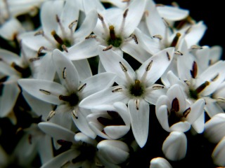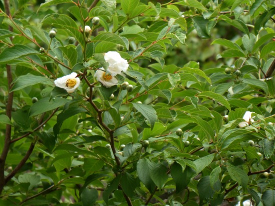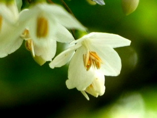 横に伸びた枝から出た小枝の先端に房状の白い花を下向きに多数つけています。花びらは5片に深く裂けるが、大きく開くことなくややつぼみぎみです。