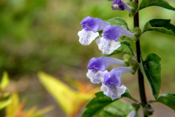 花壇に赤みを帯びた茎が生え、葉が生い茂り、花が咲くと一定方向に筒状の花が咲きました。タツナミソウ(立浪草)の名前の由来は、花が同じ方向を向いて咲き、波立った時の泡のようにみえることから名づけられたと言われています。