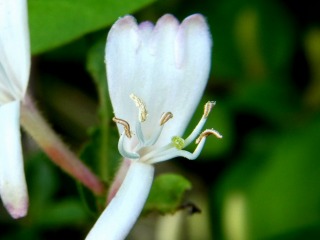 雑草の中で白い「スイカズラ」の花が咲いていました。3cmくらいの唇形で上唇は4裂し、下唇は細長く垂れ下がっています。5本の雄しべが長く突き出ています。雌しべは1個。