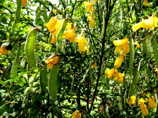 道端に咲いていた黄色いマメ科と思われる花。写真を見て、側にサヤエンドウのような実が生っていました。