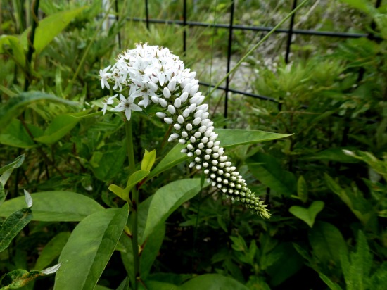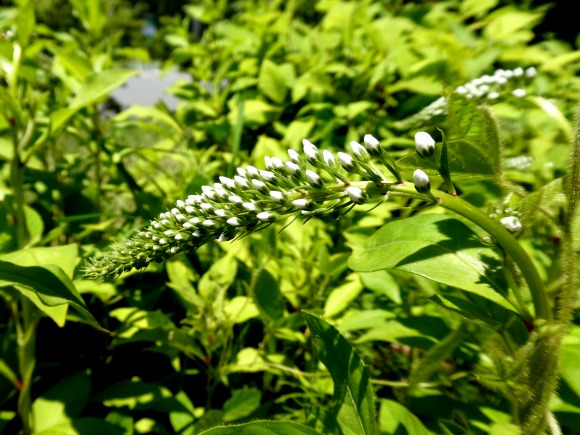 雑多の花壇のなかで茎の先端に花穂を横に伸ばしていました。花穂の形が、虎の尾に見立てたのが花名のようです。