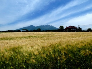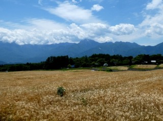 三分一湧水公園下の麦畑は刈取りが終わっているのではと思いましたが、まだ半分ほどで、麦の穂がなびいていました。