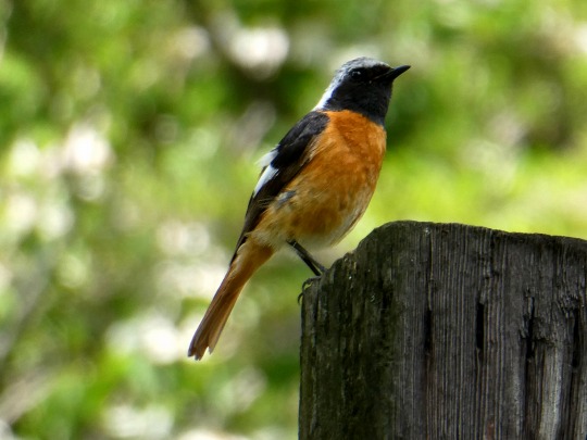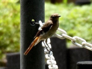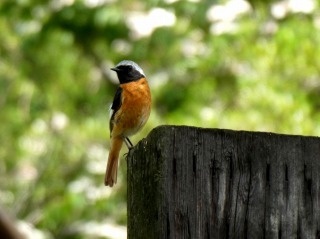 ジョウビタキが今の季節には珍しく庭にやって来ました。冬鳥の代表でオスの頭が銀白色と黒とオレンジ色の配色が美しい小鳥です。