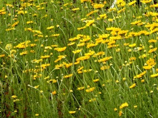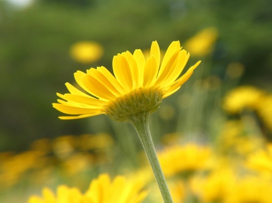 薬用植物園のハーブエリアに細い花茎を伸ばして黄色が鮮やかな花が咲いていました。