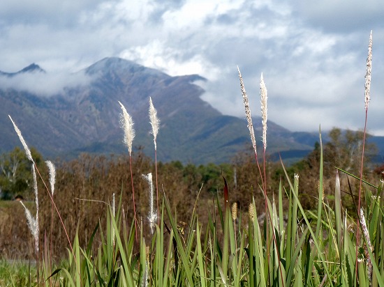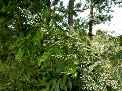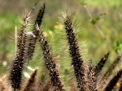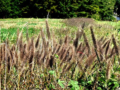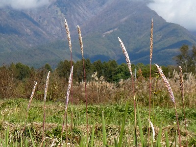 八ヶ岳が見える牧草地に猫じゃらしが大きくなったような花穂が沢山ゆれていました。引っこ抜くのが大変な力がいるそうで、花名も「チカラシバ」とついています。