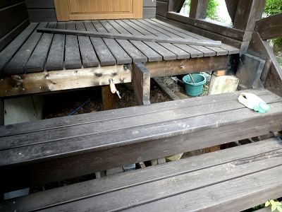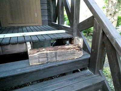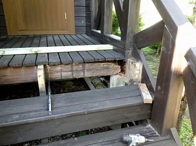 デッキの床材が沈むので調べて見ましたら、支える根太が本体から伸したログ材で出来ていました。防腐処理をされて無いログ材は雨に弱く、24年の歳月で腐食してしまいました。全てを作り替えるには材料費が嵩むため、部分修復を考えています。