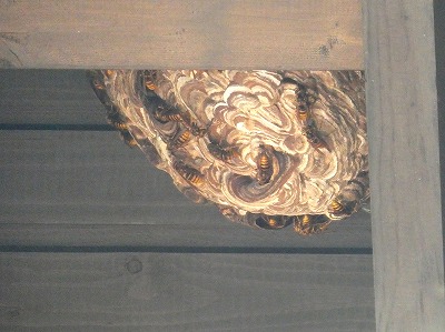 駆除には危険を伴うため近寄れず、6mの磯釣りに使う網のロッドで下から突っついて見ましたが、なかなか取れない! 突っついて巣は壊れるわ、蜂はブンブン怖い怖い思いをしました。