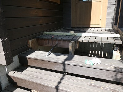 土曜日は玄関先のウッドデッキが長年の雨により床を支える根太が腐食、どのように修復するか、悩んでいます。