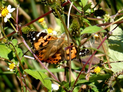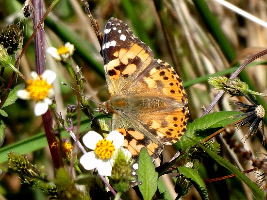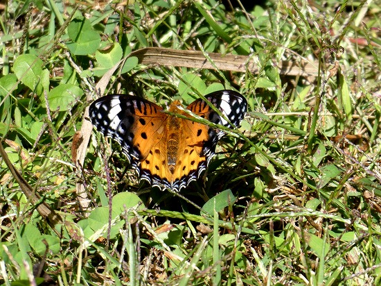 庭の草地に色彩鮮やかな蝶が止まりました。「ツマグロヒョウモン」は後翅が黒く縁取られていますが、翅先が黒と白の模様で彩られているのはメスのようです。