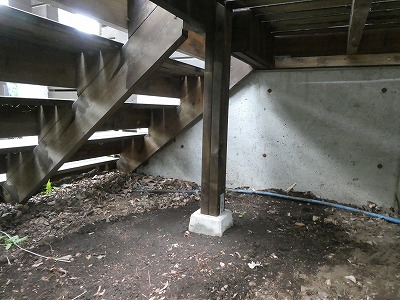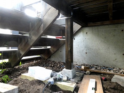 一本材が使えず継ぎ足しをしているため、コンクリートブロックを砂利、セメントで固め支柱で支えました。
