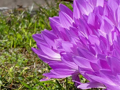 畑の脇にピンク色のきれいな花が咲いていました。花は土から直接花茎を伸して透明感がある美しい花です。花は美しいのですが、全草にコルシチンという毒を持ち危険な有毒植物でもあります。