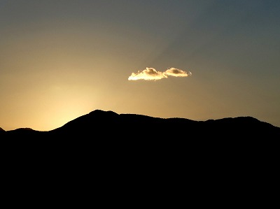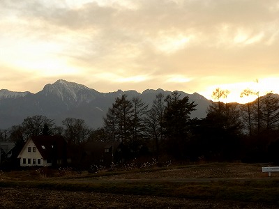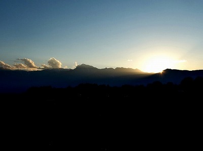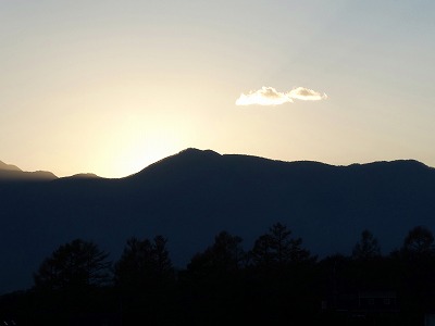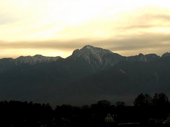 雲が多い空ですが、南アルプスの稜線に陽が沈みました。