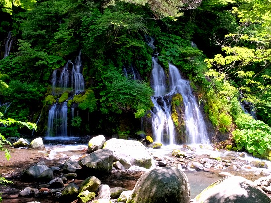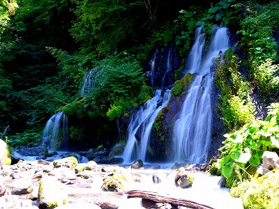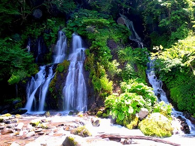 小さな滝が数段になって流れ落ちる姿は神秘的な美しさです。
