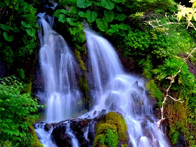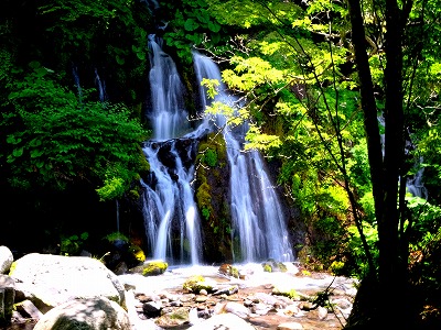 岩間から絹糸のように流れ落ちる滝は神秘的な美さです。