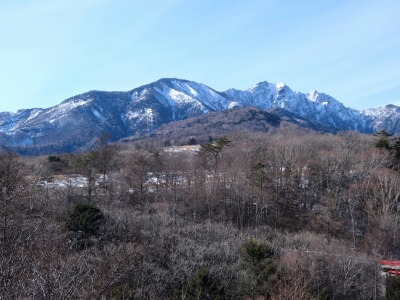 清泉寮前の道路より、正面に雪が張り付いた権現岳が輝いていました。
