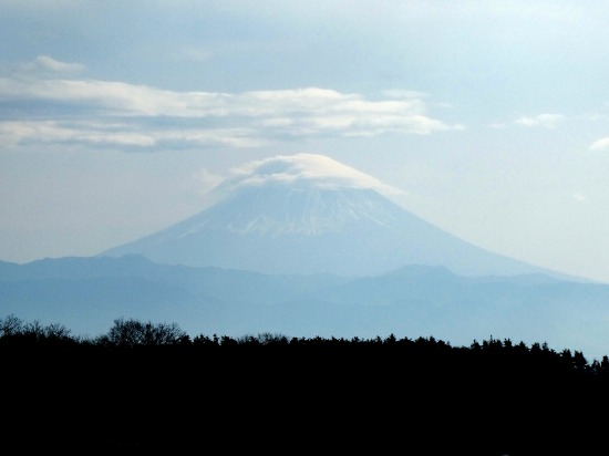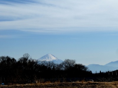 散歩の途中から見えた今日の富士山は笠雲が掛っているように見えましたが、見晴らしの良い畑に出ると、雲は山頂付近に張り付いたようになっていました。