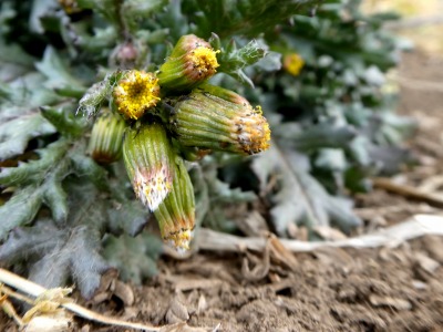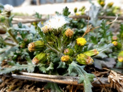 寒いこの時期、何とかここに載せるような野草が咲いていないだろうか、枯れた草むらを探すと黄色い「ノボロギク」が咲いていました。開花は通常5-8月に咲く花ですが、寒冷地では珍しいです。寒さに耐えて咲き傷んだ様子でした。