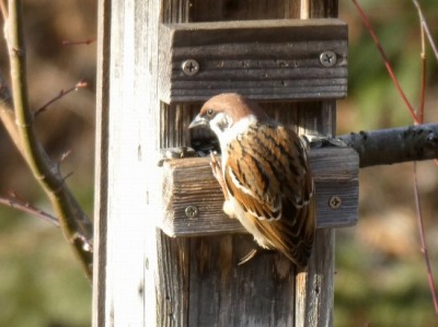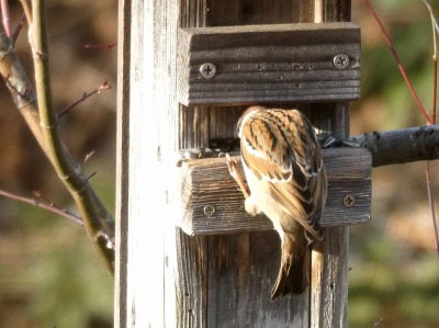 エサ箱にしがみ付いて離れないスズメ、他の野鳥が近寄れません。