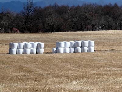 身曾岐神社の下に広い牧草地があり、白く巻かれたロールが積まれていました。