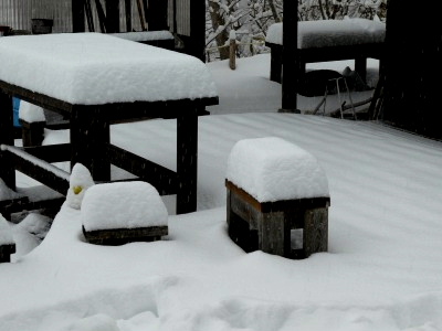 今期一番の大雪、DIYの作業台も今夜降り続けると20センチを越えそうです。