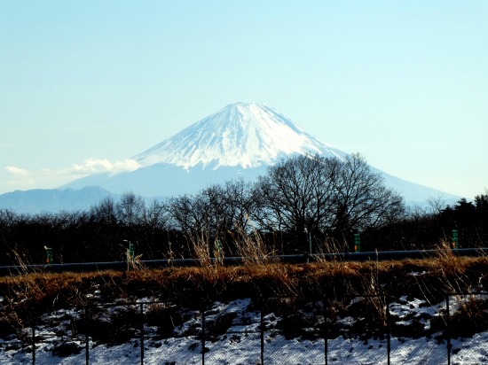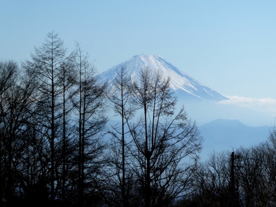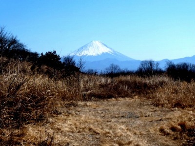 釜無川より望む富士山は冬枯れの草木の先に雲ひとつ無いきれいな姿を見せていました。