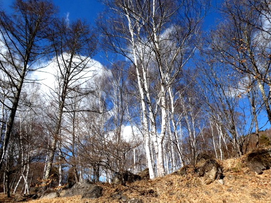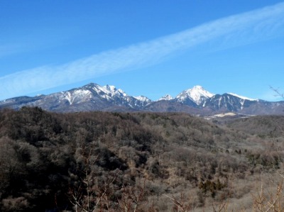 散歩道から見えた八ヶ岳は、青い空に白い雲、前景の樹木が良い雰囲気を見せていました。
