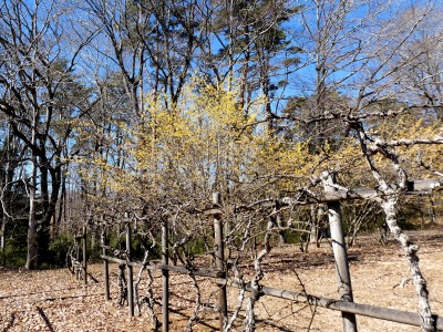色の無い冬の植物園に、離れたところに黄色い葉か花が見えました。