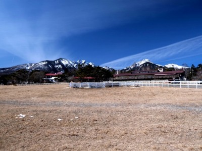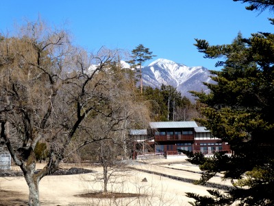 広い園内は人っ子ひとりいませんでした。今日は管理棟の後方に白銀の八ヶ岳がそびえていました。