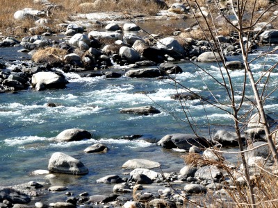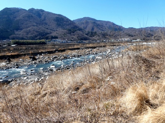 韮崎辺りの釜無川は南アルプス山麓と八ヶ岳の七里岩の間を流れるのどかな風景です。