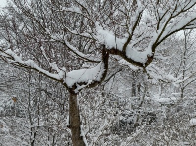 大きくなりすぎて、枝打ちしたカエデの樹木に雪が積り、何時もと違う姿に見えました。