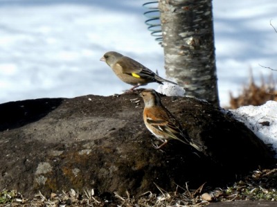 同じアトリ科の野鳥です。アトリとカワラヒワが並んでいました。アトリの大きさはカワラヒワより少し大きいようです。
