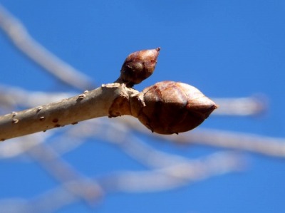 冬の八ヶ岳薬用植物園にベニバラトチノキの蕾が膨らみ、春が近いことを知らせています。