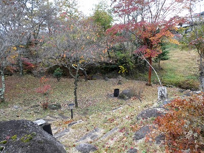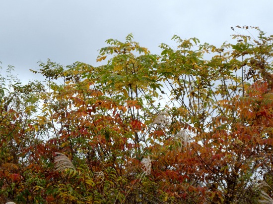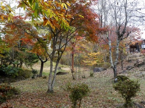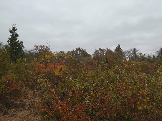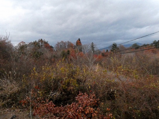 今日は厚い曇り空で、山景色は見えませんが、雑木林は色づいています。